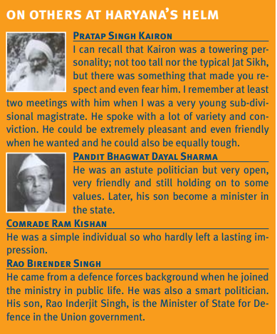 I was closely associated with four chief ministers of Haryana: Chaudhary Bhajan Lal, Bhagwat Dayal Sharma, Chaudhary Devi Lal and Chaudhary Bansi Lal. All four were unique. In fact, once when I was Chief Secretary (for the third time), something interesting happened. I think, it was in 1996. I went to see Chief Minister Bansi Lal on official work. He asked me to sit comfortably before I could even open the official discus- sion. He asked me to compare him with Chaudhary Bhajan Lal as chief minister.