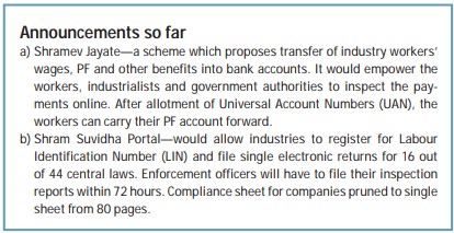 SHRAMEV Jayate, a scheme unveiled by Modi in October 2014, promises protection to manufacturing units against selective inspections, digitisation and portability of provident fund accounts through allotment of Universal Account Numbers (UAN) to industry workers. Under the scheme, a unique Labour Identification Number (LIN) will be allotted to each unit and, once it registers on the Shram Suvidha Portal, it will be in a position to file self-certified single online return for 16 out of 44 central labour laws.
