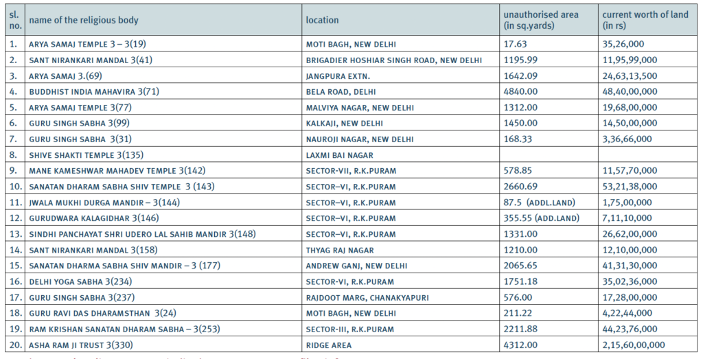 The survey found that 103 religious and social organizations and two educational institutions had illegally occupied land. Of them, the Guru Singh Sabha in Nauroji Nagar and the Guru Ravi Das Dharamsthan in Motibagh transferred their land to the Delhi Development Authority (DDA). The Jagannath Mandir in Bela Road and the Nirmal Sant Kutia in Guru Tegh Bahadur Nagar, near Shastri Market, also transferred their land to DDA “for care and maintenance”. Proceedings for such transfer of land have been initiated by some more organizations but 83 of them continue to occupy land illegally.