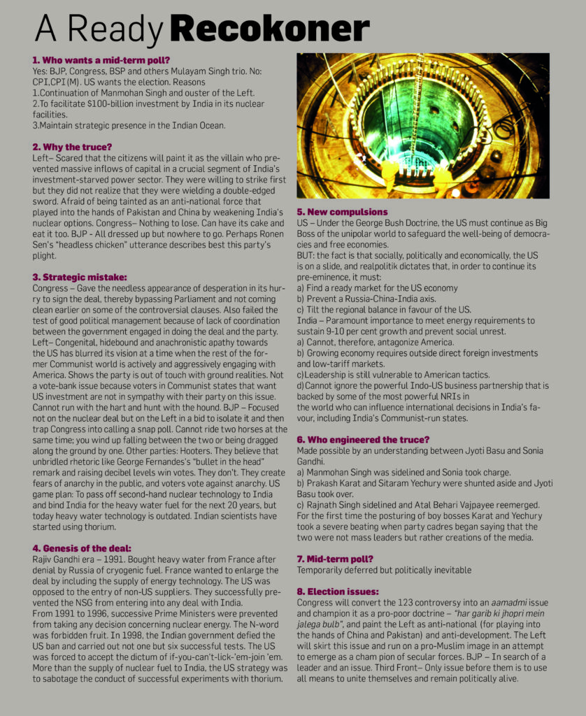 Over the last month the media has carpet-bombed the nation with a combination of news, views, editorials, opinions, snap polls, and instapunditry about the Indo-US nuclear deal (123 Agreement) and its political fallout with such ferocity that we ordinary mortals feel shell-shocked. Our instinct right now is to head for bomb shelters to protect ourselves from the confusion raining down on our heads from television screens, Internet blogs, and newsprint. What’s really going on? Who are the Good Guys, who are the Bad Guys? Is Uncle Sam trying to smother us in a neo-Imperialist bear hug? What does the Left really want? Has our Prime Minister sold us out? Is the media taking sides? Is there a political collapse ahead? Will there be a mid-term poll? Are the BJP and Marxists pursuing a new Minimum Common Programme? Who is sleeping with which enemy? What is the geopolitical context of this entire controversy…? The gfiles editorial team retreated into its private bomb shelter – our editorial office – to cogitate on some of these issues.