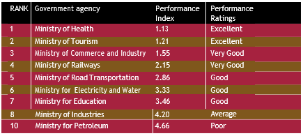 It is not only important to conduct a good evaluation of the government’s performance, the results must be com-municated effectively. The emerging international best practice in this area is clear.Leading performance management systems in government convey results in the form displayed in the adjacent table. The performance of each min-istry/department is ranked on a scale of 1 to 5, where 1 is equal to excellent and 5 represents “poor” performance.