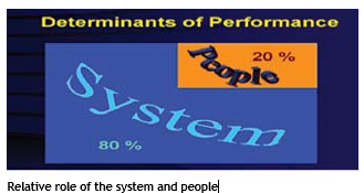 To the student of management, this is not surprising. It is said that 80 per cent of the performance of any organization depends on management systems and only 20 per cent on people, as shown in the figure at left. Of this 20 per cent, 80 per cent is accounted for by the quali-ty of leadership. Leadership, and rank and file account for 16 per cent and 4 per cent, respectively.