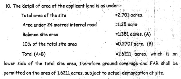 On Page 7, point 10 of the sanction report states that as after deducting the land for the road the remaining 1.62 acre is on lower side of the total site area, therefore the ground coverage and FAR shall be permitted on the area of 1.62 acres, subject to actual demarcation of site.