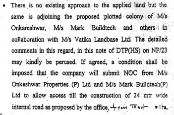The operative part of the report is summarised between pages 27-29, which is inconsistent with the earlier notes: “There is no existing approach to the applied land but the same is adjoining the proposed plotted colony of M/s Onkareshwar, M/s Mark Buildtech and others in collaboration with M/s Vatika Landbase Ltd. The detailed comments in the regard, in this note of DTP (HS) may kindly be persued. If agreed, a condition shall be imposed that the company will submit NOC from M/s Onkareshwar Properties (P) Ltd and M/s Mark Buildtech (P) Ltd to allow access till the construction of 24-metre wide internal road as proposed by the office, from their site.”